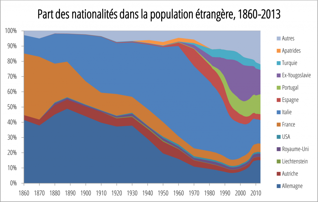 A l'origine, l'immigration étrangère en Suisse est avant tout celle des voisins: jusqu'en 1970, les pays limitrophes fournissent 90% de l'immigration. La première immigration est germanique: de 1860 à 1930, allemands, autrichiens et liechtensteinois représentent la moitié de la population immigrée; la part des français, initialement importante, n'a eu de cesse de décroître, au profit des italiens, qui deviennent les plus nombreux dans la population immigrée dès la fin de la seconde guerre mondiale, et dominent l'immigration jusqu'en 1970.
