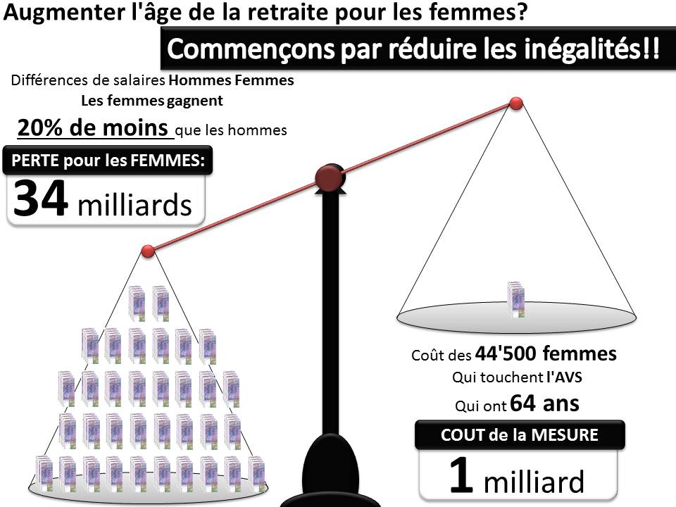 Avec 20% de salaire en moins, les femmes perdent des dizaines de milliards de francs, alors que l'AVS pour les femmes à 64 ans ne coute qu'un milliard. Commençons par combattre les inégalités sérieuses et dommageables aux femmes, avant de démanteler le peu d'acquis qu'elles ont.. D'autant plus que malheureusement, avec le partage des tâches dans la majorité des familles suisses, les femmes qui arrivent à la retraite à 64 ans ont souvent travaillé beaucoup, beaucoup plus d'heures que les hommes, lorsque l'on inclut les tâches domestiques.