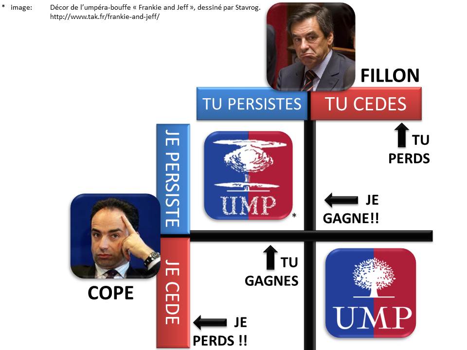 J’adore le dilemme du prisonnier* ! Il permet d’expliquer tout…. enfin en tous cas beaucoup de choses ! Prenez par exemple le duel Fillon-Copé en France. La solution idéale pour l’UMP ? Chacun cède, on enterre le plus vite possible ce monumental échec et on s’unit contre la gauche. Le problème est que comme montré dans le schéma ci-dessus, ce n’est pas dans l’intérêt des protagonistes. En effet, si l’un cède, l’autre peut immédiatement en tirer tous les lauriers.