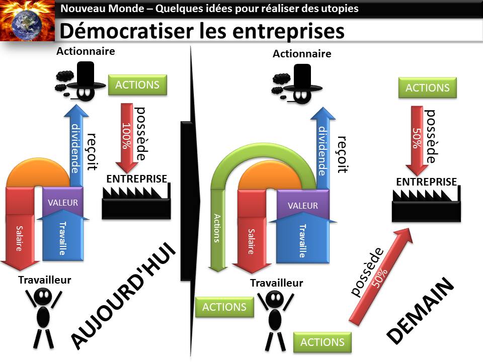 Par contre, en 20 ans, les employés de leurs entreprises auraient déjà un pouvoir significatif sur leur société. En 50 ans, ils y seraient majoritaires, et pourraient prendre les décisions qui les concernent. Qui sait, alors, si nous aurions toujours des salaires aussi abusifs ?