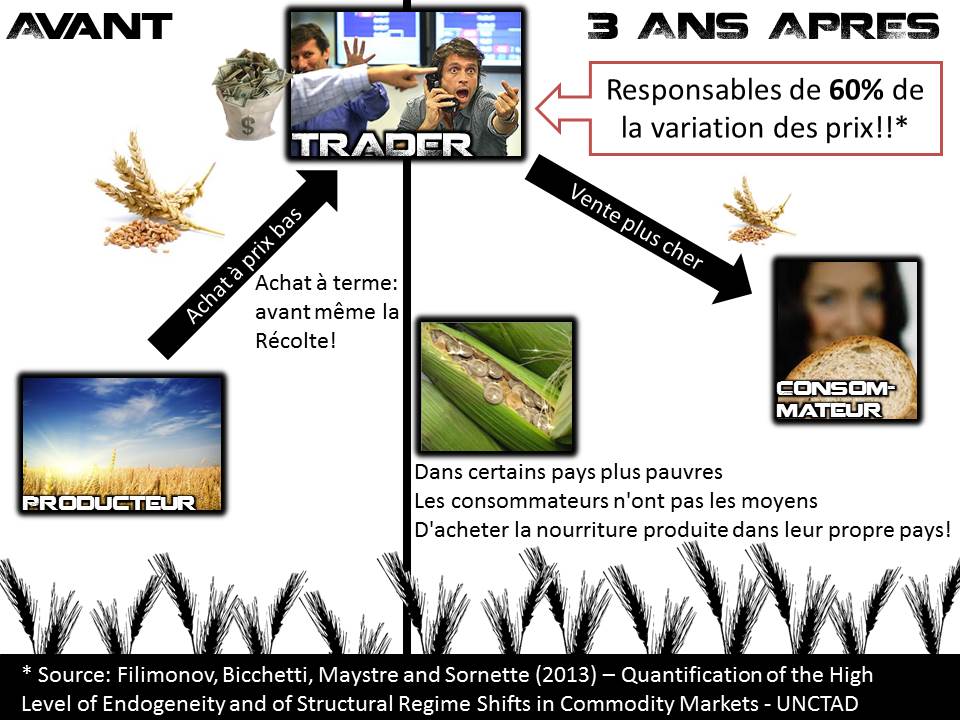 Une étude vient d’être rendue publique, qui indique qu’environ 60% à 70% de la variation des prix sur les denrées alimentaires seraient due à des facteurs « endogènes » au système de trading. Qu’es-ce que cela veut dire ? Que seulement 60 à 70% des variations des prix des denrées alimentaires sont liées à des facteurs qui n’ont rien à voir avec l’économie réelle, mais qui sont uniquement liés à la spéculation financière. Pire, l’étude montre que cette influence des marchés financiers sur les biens alimentaires va en augmentant depuis les années 2000.