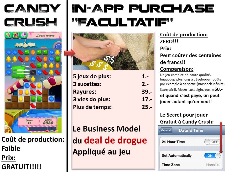 Candy Crush, vous connaissez peut-être, on peut y jouer partout ou presque. Et c’est gratuit. Enfin au début. C’est un jeu plutôt amusant, très classique, mais qui a comme la drogue la propriété d’être addictif. On a de la peine à s’arrêter d’y jouer, même si c’est simple. Un peu comme Tetris avant. Comme la drogue, la première dose est gratuite. Mais assez rapidement, si on joue beaucoup et qu’on doit recommencer certains niveaux, il faut payer ou attendre longtemps. Après si on veut aller plus loin, il faut payer ou attendre très longtemps entre chaque niveau. Enfin, certains niveaux sont difficiles et si on veut les passer sans payer, cela peut devenir extrêmement difficile. Et c’est là que vient l’arnaque. Comme la drogue, une fois qu’on est accro, c’est cher.