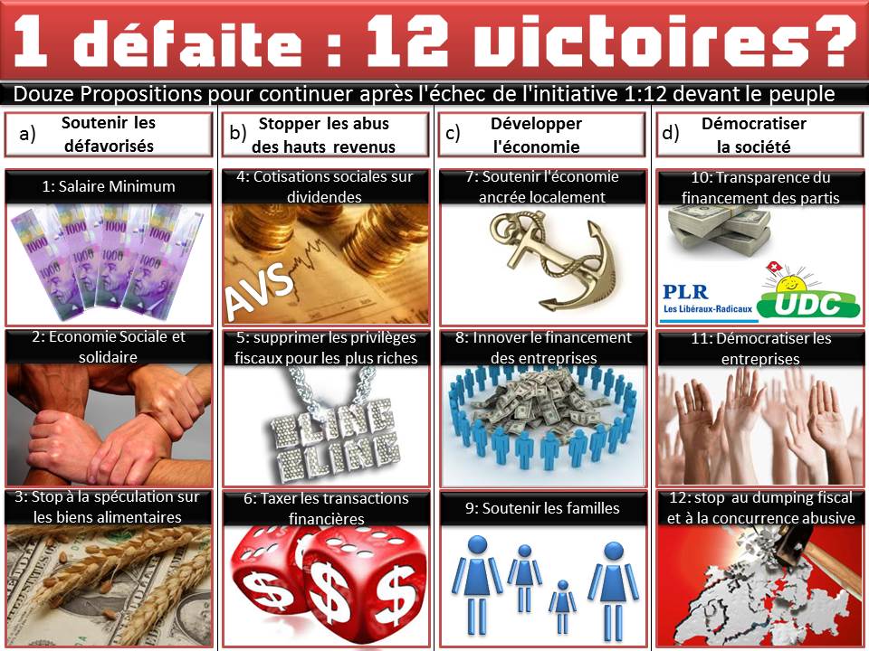 Voici douze propositions qui répondent à ces arguments, et qui peuvent donner un peu d’espoir à celles et ceux qui, comme les initiants d’1 :12, aspirent à une société plus juste. Il reste beaucoup de choses que l’on peut faire dans ce sens, et si l’échec de l’initiative 1 :12 n’est pas agréable pour la gauche, nous pouvons avoir espoir que d’autres mesures pourront atteindre les mêmes buts, peut-être même mieux.