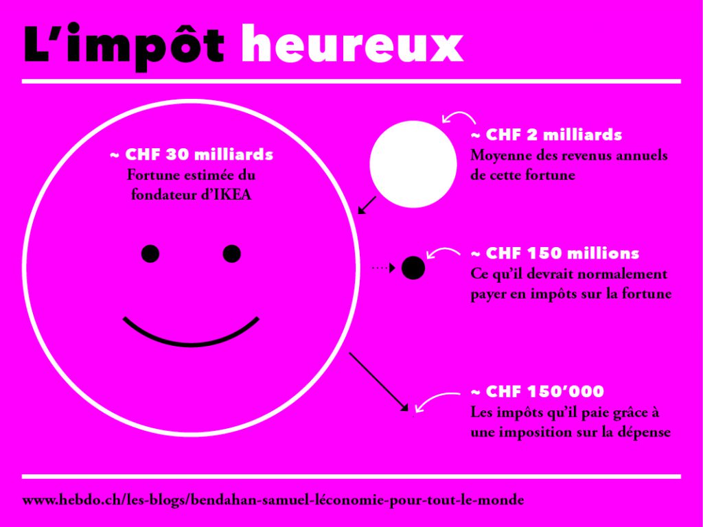 Avec « seulement » un milliard de francs, un super riche peut payer le taux NORMAL d’imposition, et malgré tout vivre dans une gigantesque maison de maître et en offrir une à ses 19 plus proches. Il peut manger trois fois par jours, et tous les jours, dans un restaurant gastronomique trois étoiles, et faire un mois de vacances par année dans les chambres les plus chères des hôtels les plus chers du monde. Il peut le faire pendant 100 années, même si sa fortune ne rapportait rien. S’il place sa fortune à 1% (ce qui est bien plus bas que les revenus des capitaux de ces dernières décennies), il peut continuer à ce train de vie tout en augmentant sa fortune ! Est-ce vraiment tolérable que des personnes peuvent avoir autant, alors que des milliards d’autres n’arrivent pas à joindre les deux bouts, tout en travaillant très dur ? Malgré leurs immenses richesses, les 1300 forfaitaires du canton de Vaud ne contribue qu'à hauteur de