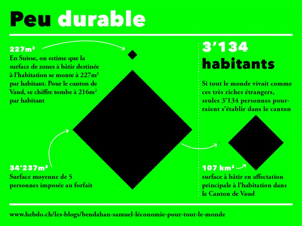 On oublie aussi souvent de se poser la question du développement durable. L’initiative Ecopop, par exemple, prétend que c’est la population qui cause les problèmes écologiques. Le vrai problème, ce ne sont pas les gens, mais c’est la surconsommation des ressources limitées. Un exemple de ces ressources limitées, c’est l’espace sur lequel on peut bâtir. En moyenne, par exemple dans le canton de Vaud, la surface en zone à bâtir destinée à l’habitation par habitant est de 216 mètres carrés. Par contre, cinq des forfaitaires pour lesquels nous avons pu nous procurer les données d’utilisation du sol occupent, chacun et en moyenne 34'237 mètres carrés en zone destinée à l’habitation ! Si chaque habitant du Canton de Vaud devait vivre avec ce train de vie, il n’y aurait la place que pour 3’134 habitants au forfait, au lieu des 743'000 qui y habitent actuellement.