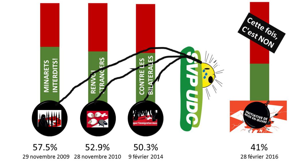 Le résultat du 28 février 2016 est certes une grande victoire pour la Suisse et l’état de droit. Cela nous donne aussi de l’espoir pour les défis à venir pour notre pays. Après l’acceptation de tant d’initiative populistes et agressives, comment se fait-il que le peuple donne un non si massif ? Comment le peuple qui accepte une initiative contre les travailleurs étrangers peut refuser ainsi un texte qui s’attaque pourtant aux criminels étrangers ?