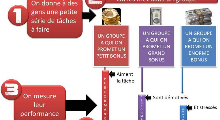Dan Ariely par exemple a fait une étude édifiante à ce sujet, en Inde. Il a comparé trois groupes de personnes à qui l’on avait demandé de faire une série de tâches. A un groupe, il a promis un petit bonus si la performance était bonne. A un autre groupe, le bonus promis était beaucoup plus gros (équivalent à 2 semaines de travail). Le troisième groupe s’est vu promettre un bonus stratosphérique: l’équivalent de 5 mois de salaire. Le résultat est clair: plus le bonus était élevé, moins les gens ont réussi à accomplir la tâche, plus la performance était basse, et moins les gens ont apprécié la tâche.