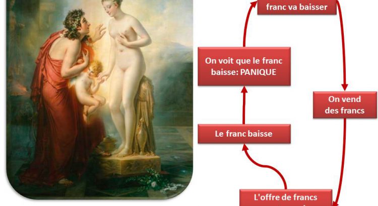 Evidemment, si c’était la seule explication des phénomènes économiques, le franc s’écraserait jusqu’au bout au moindre choc. On n’en est pas du tout là : il y a d’autres facteurs qui donnent à une monnaie son prix, et les gens arrêtent de craindre la chute au bout d’un moment. Au fait, ces effets de prophéties auto-réalisatrices ont certainement un effet amplificateur. Lorsque pour de « bonnes » raisons, il y a une variation sur le marché, les croyances des masses peuvent transformer ce battement d’aile de papillon en tempête. Or, un cataclysme basé sur quelques croyances est sans aucun doute un phénomène un peu exagéré : encore une des imperfections du système économique actuel.