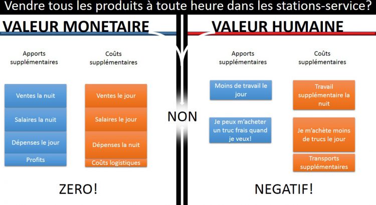 Le problème de tous ces apports, c’est qu’ils sont mécaniquement compensés. En effet, la vente la nuit ne produit rien. Il s’agit juste d’opérer des transactions, pas de créer de la valeur. Ainsi, cette loi ne crée pas de valeur monétaire, mais la répartit simplement autrement. Les ventes de jour diminueront mécaniquement. D’ailleurs, ce qui profite aux stations-service coûtera aux commerces locaux qui ne peuvent ouvrir la nuit. Evidemment, une partie du personnel travaillant le jour sera réorienté la nuit : comme on ne crée pas de valeur supplémentaire, pour être rentables, les opérateurs n’engageront pas de personnel en plus. S’ils en engagent, c’est que d’autres commerces de jour auront dû fermer car la clientèle s’est déplacée. Enfin, les gens dépenseront plus d’argent la nuit pour ces achats. Souvent, le rapport qualité-prix dans les stations-service est moins bon qu’ailleurs, et les coûts logistiques personnels ou des entreprises pour nous permettre ces achats à tout moment sont élevés.